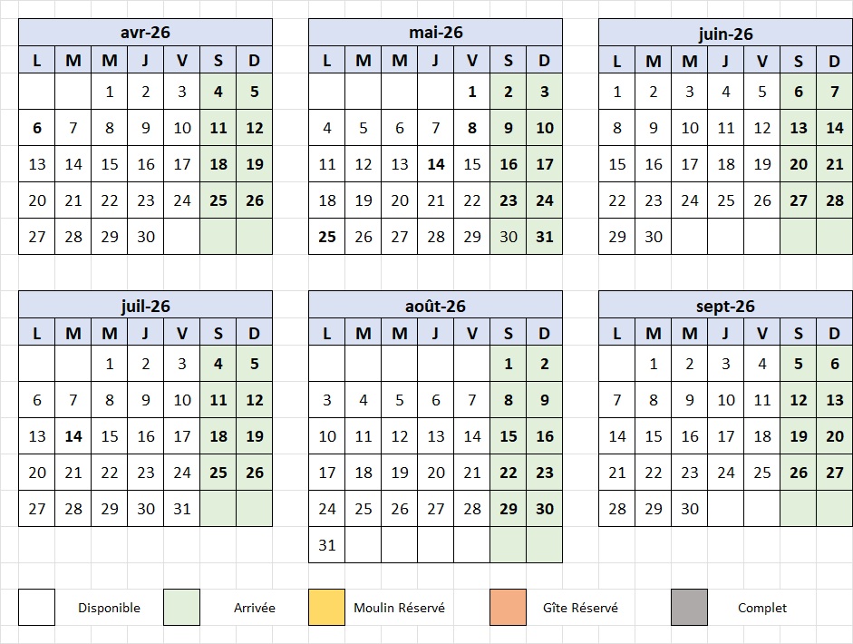 | Moulin | 2100 € | 1750 € | 1400 € | 1,30 € par pers. et par jour | + 150€ |