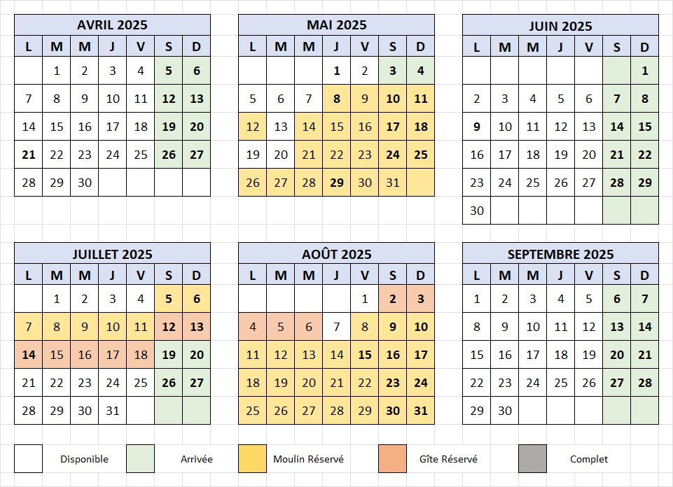 | Moulin | 2100 € | 1750 € | 1400 € | 1,30 € par pers. et par jour | + 150€ |