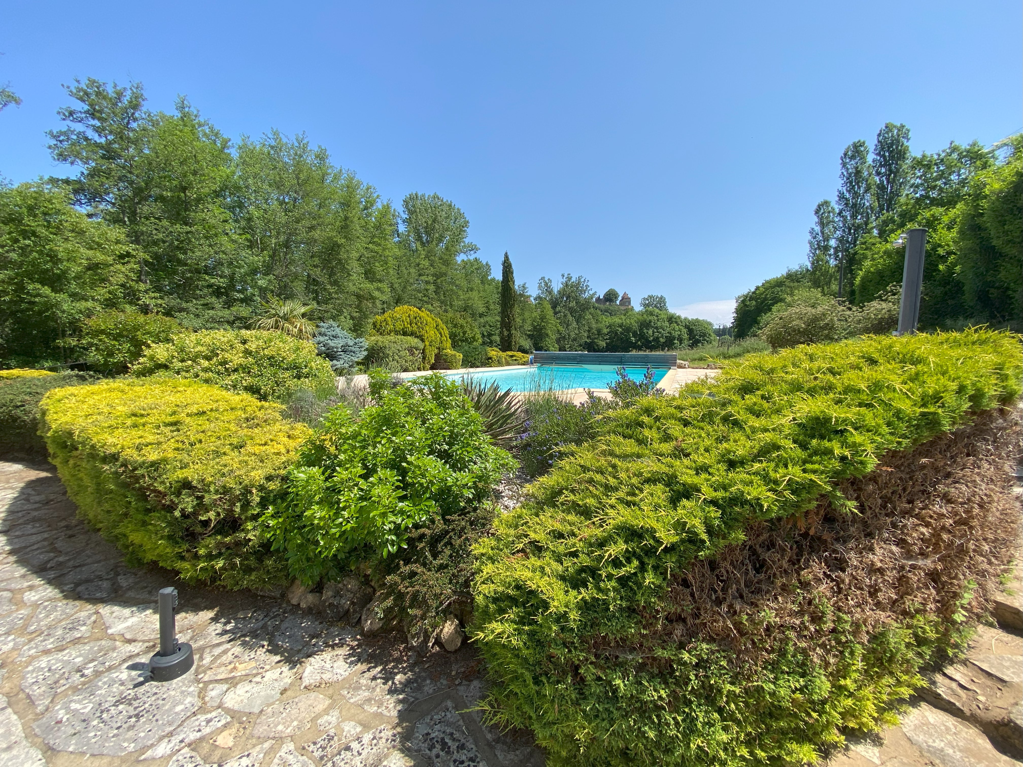 Piscine 14m x 7m partagée avec les occupants du moulin (propriétaires, famille ou amis), protégée par un rideau électrique, équipée avec 6 transats, 2 grands parasols et une douche solaire.