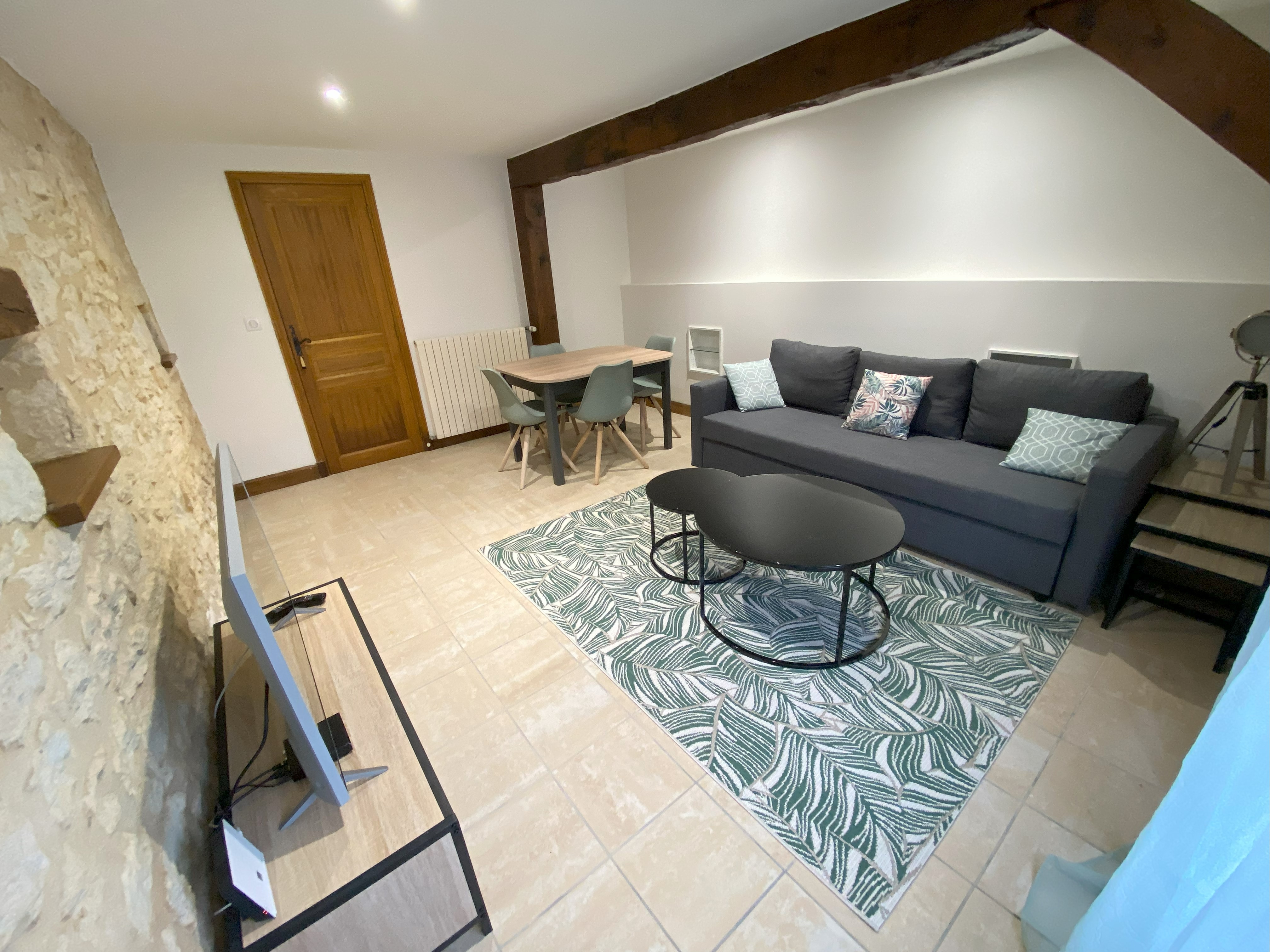 Séjour équipé d'un canapé lit 200cm convertible 2 personnes, tables basses, une table, 4 chaises, meuble télé et smart TV.