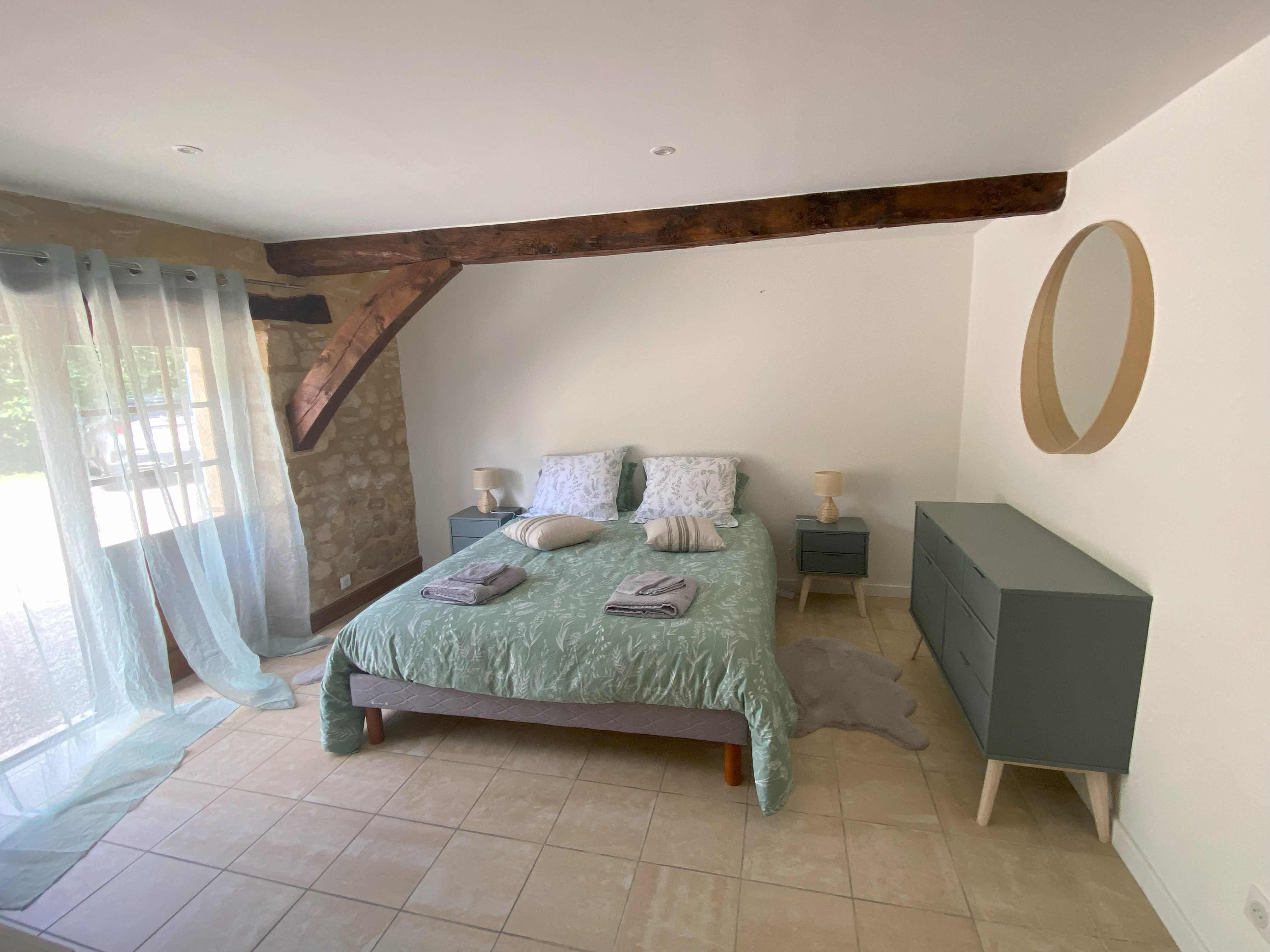 Grande chambre avec lit 160cm x 200 cm, 2 chevets, meuble de rangement et portant.