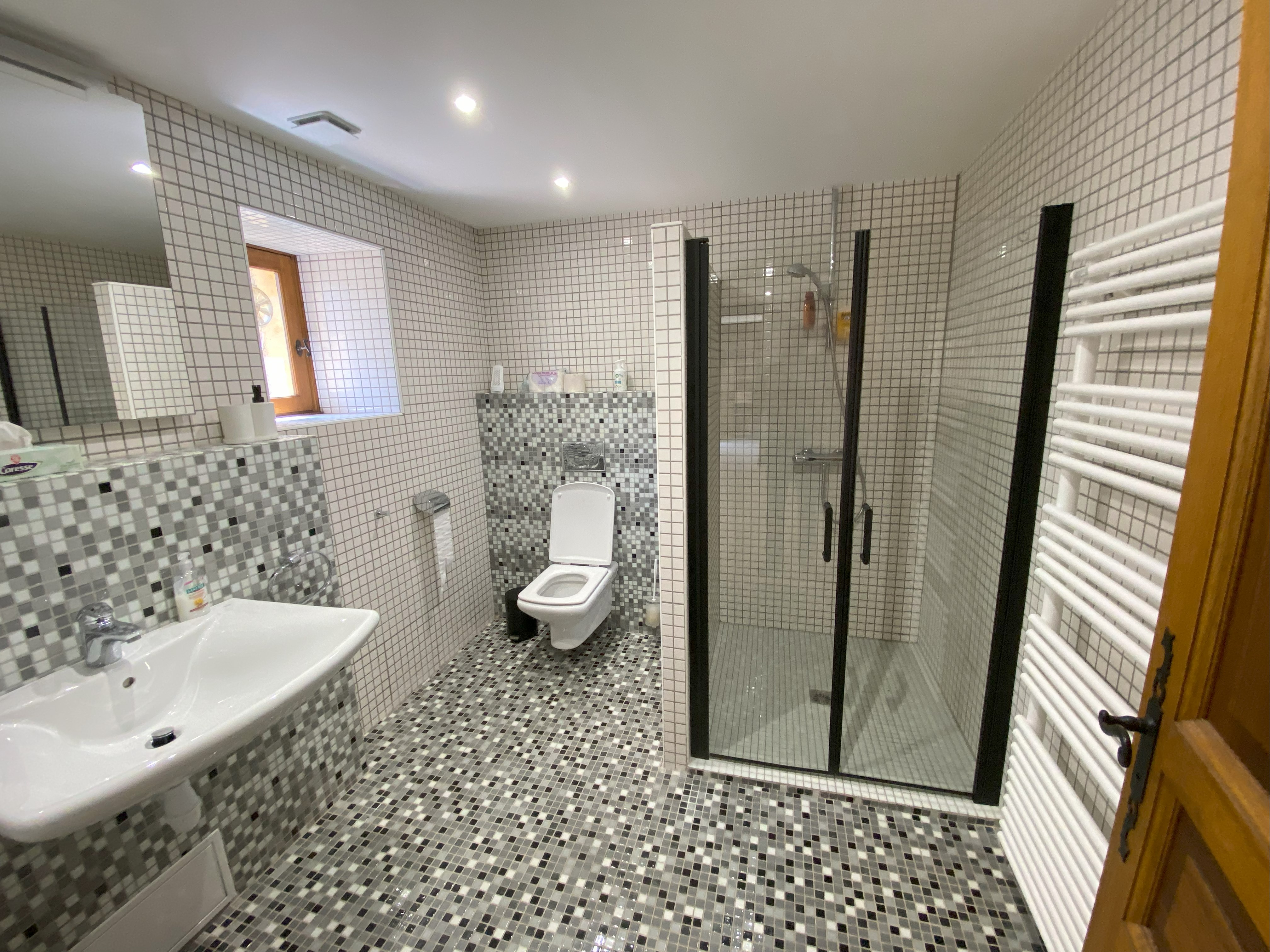 Grande douche, lavabo, WC, radiateur sèche-serviettes.