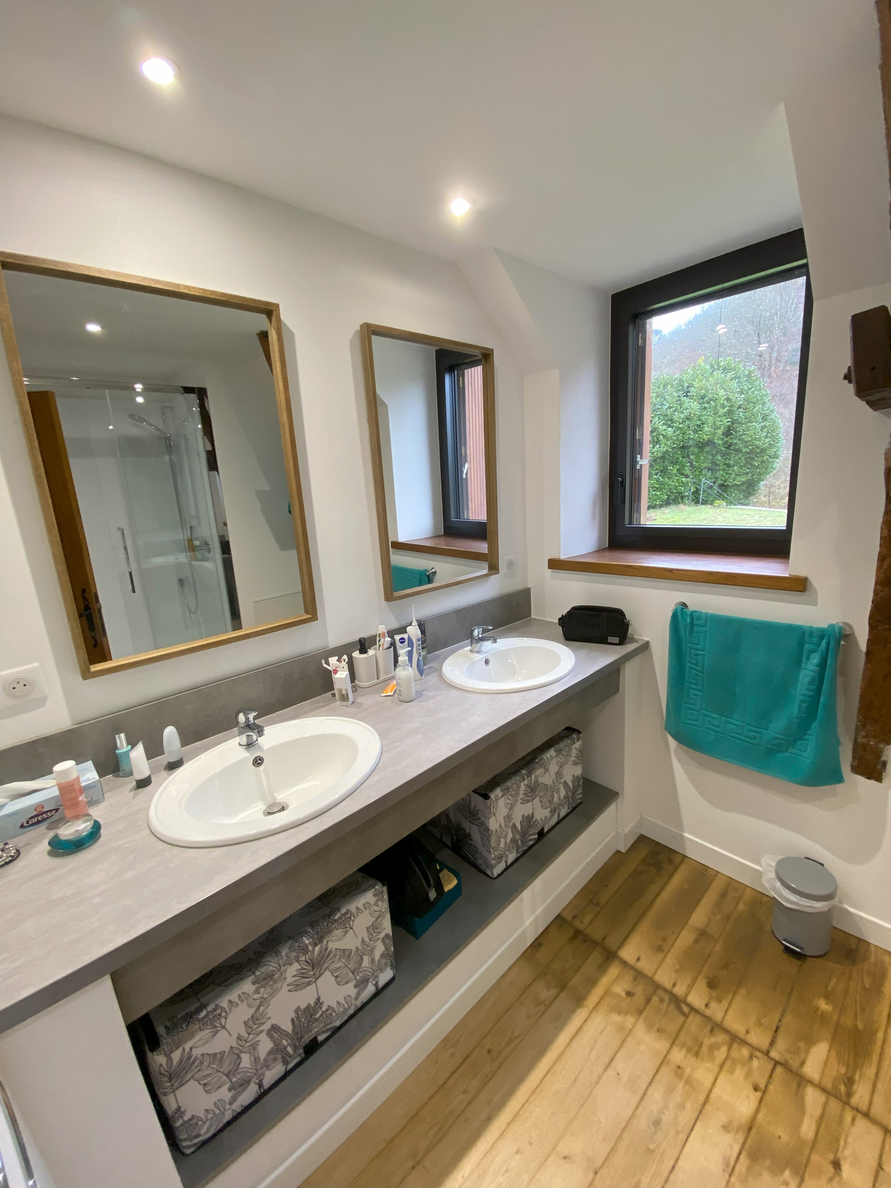 Salle d'eau avec grande douche cabine (120cm x 80 cm), double vasque, sèche-serviettes.
