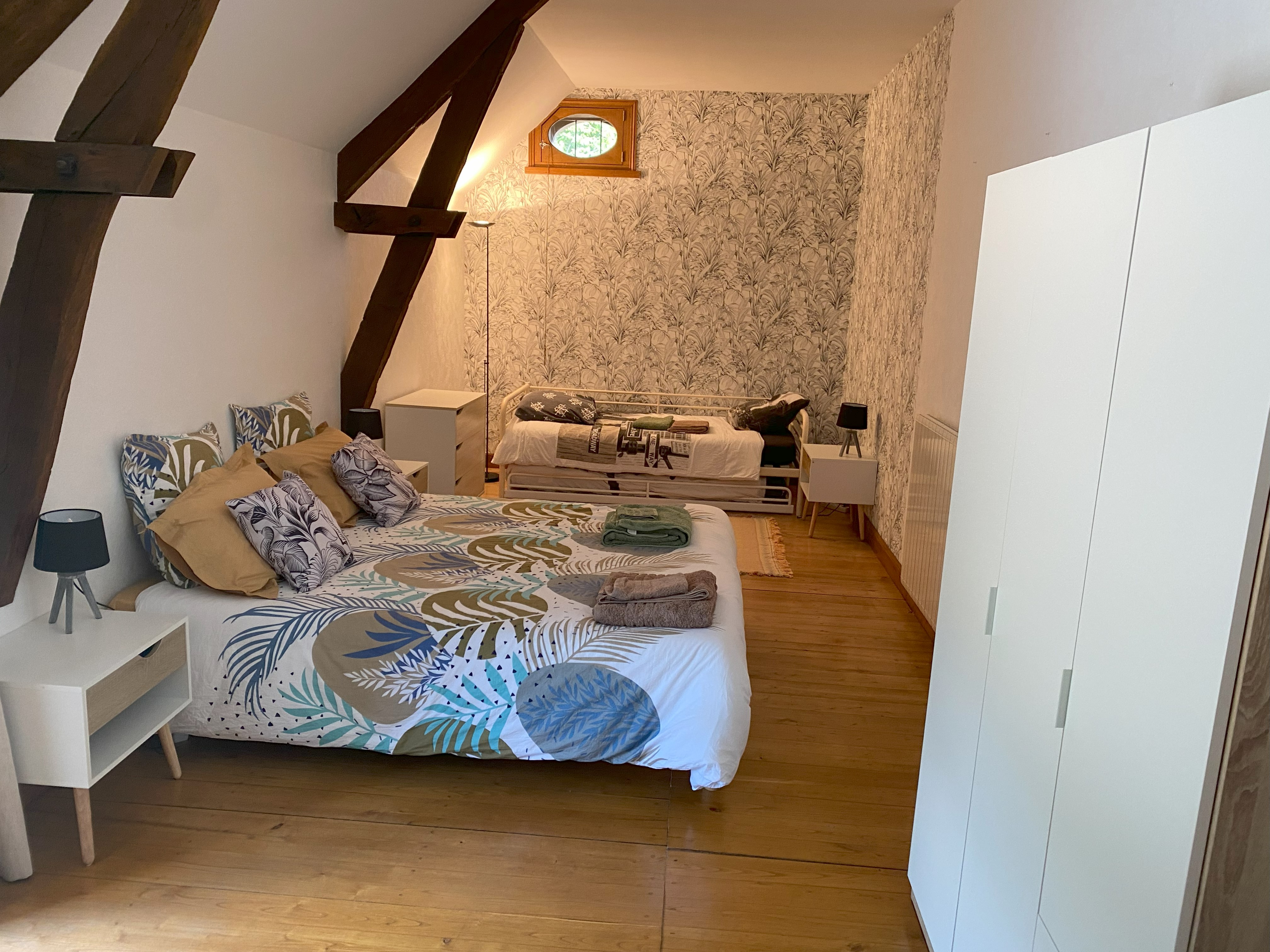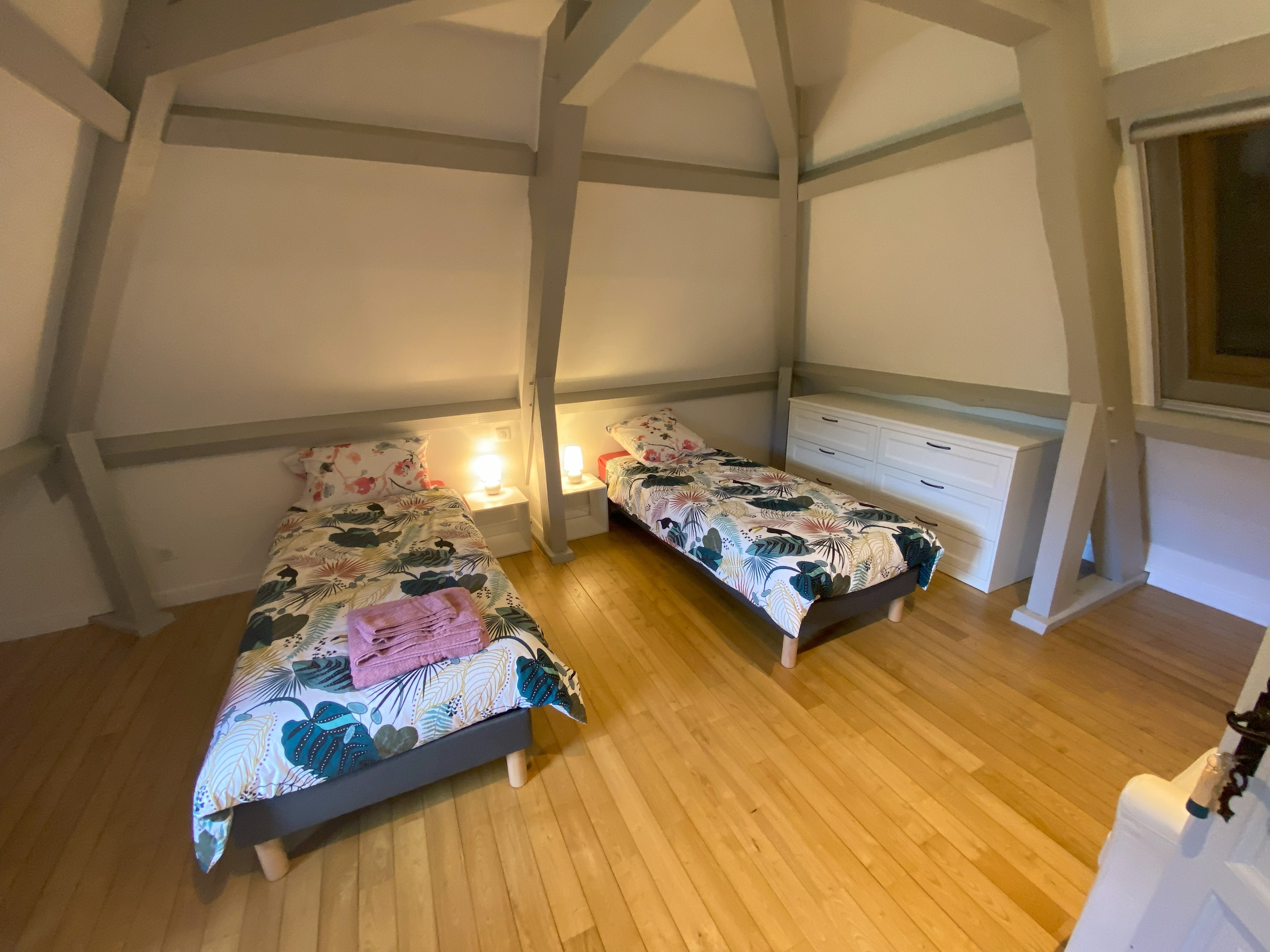 2 lits simples 80cm x 200cm, 1 commode, placard sur le palier.